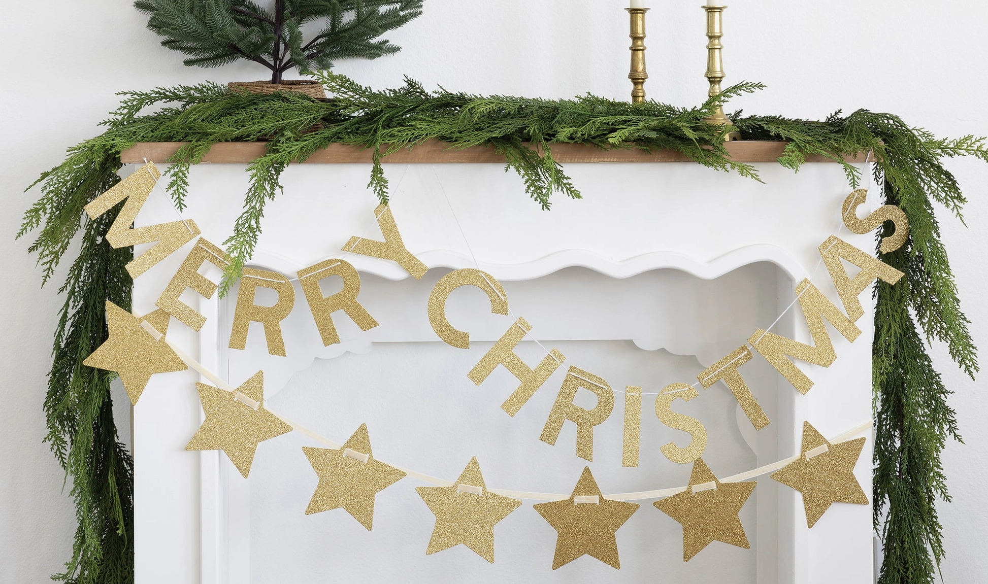 1 MERRY CHRISTMAS banner • chunky gold glitter • banner is approximately 5 feet long