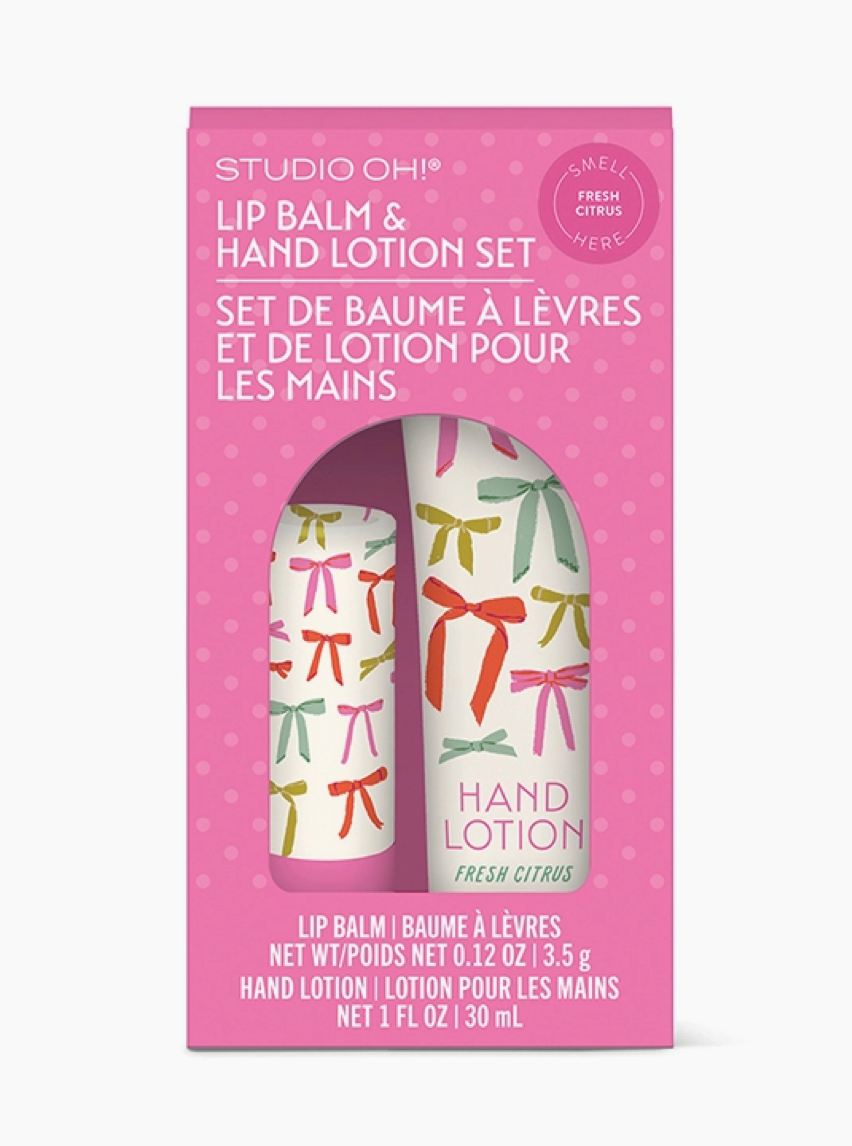 The Lip Balm & Hand Lotion Set from Studio Oh! includes a 1 oz hand cream and lip balm packaged in a clear, reusable pouch. The unscented lip balm helps gently moisturize and smooth dry lips, while the scented hand lotion hydrates hands and cuticles. The two-piece set is artfully designed and perfect for carrying in a handbag or gifting to a friend.